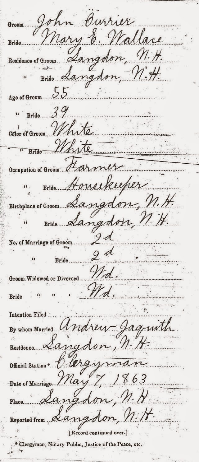 So by 1860 William's death had left Mary a widow. His sister Emeline's death in 1861 left another Langdon citizen a widower, a farmer and lifelong resident of Langdon by the name of John Currier. In the 1800's marriage could be inspired by love and romance and mutual attraction. But it could also be inspired by mutual needs beyond companionship and procreation. Running a farm in that era was no easy task and more hands made the workload more manageable, especially the hands of a hard working wife. In 1863 widow Mary Morrison Wallace became the wife of John Currier. Brother and sister in law by marriage, both now widowed by the death of their spouses, they became husband and wife.